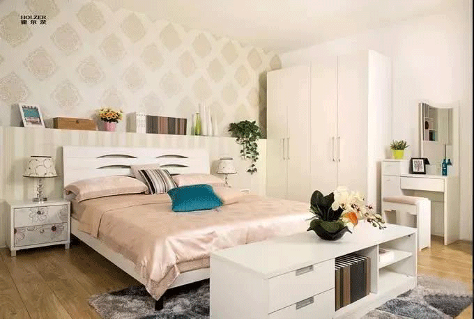 虽然大白墙依旧是墙面颜色的主流,但在装修卧室时不妨将墙面颜色换一下,最好选择浅色系,米色,浅灰色都是很好的选择,并且与床、家具等相配,能够起到安眠宁神的作用。如果想增加一些活力,则可以将梳妆台、沙发等选择亮色,做些点缀。